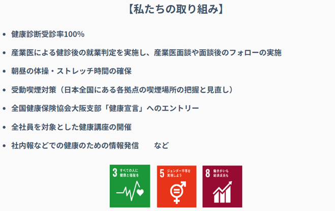 前回は「50名以下の事業所にも産業医による健診後の就業判定を実施し、産業医面談や面談後のフォローを行い健康意識の高揚を図る」という取り組みを行い、認定を得ることができました。